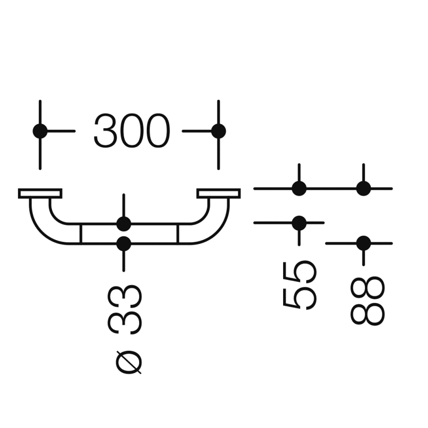 - Stangen ø 33 mm, Rosetten ø 70 mm, 88 mm tief, lichter Abstand zur Wand 55 mm