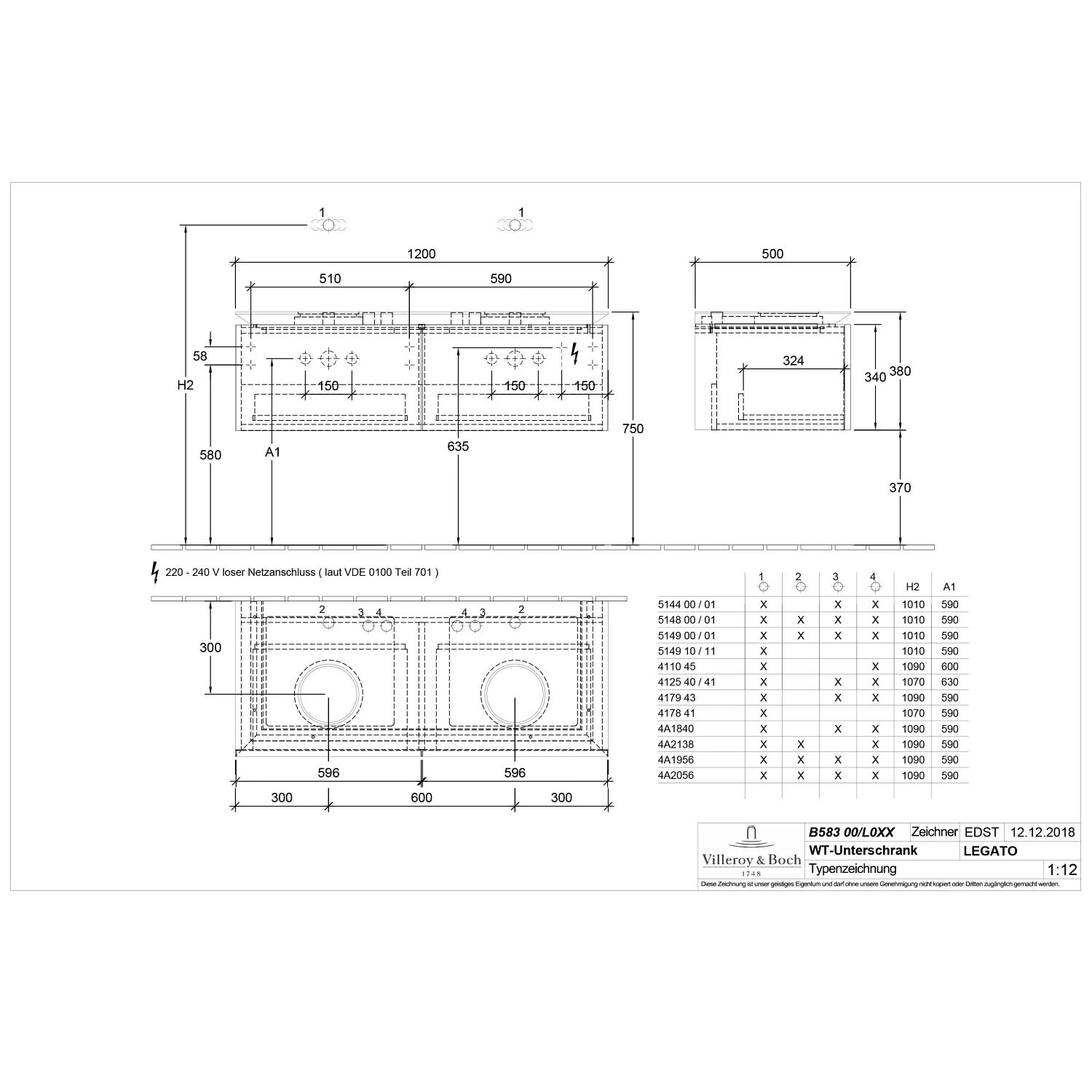 Villeroy & Boch Legato Waschtischunterschrank 120 cm mit 2 Auszügen, für 2 Waschtische