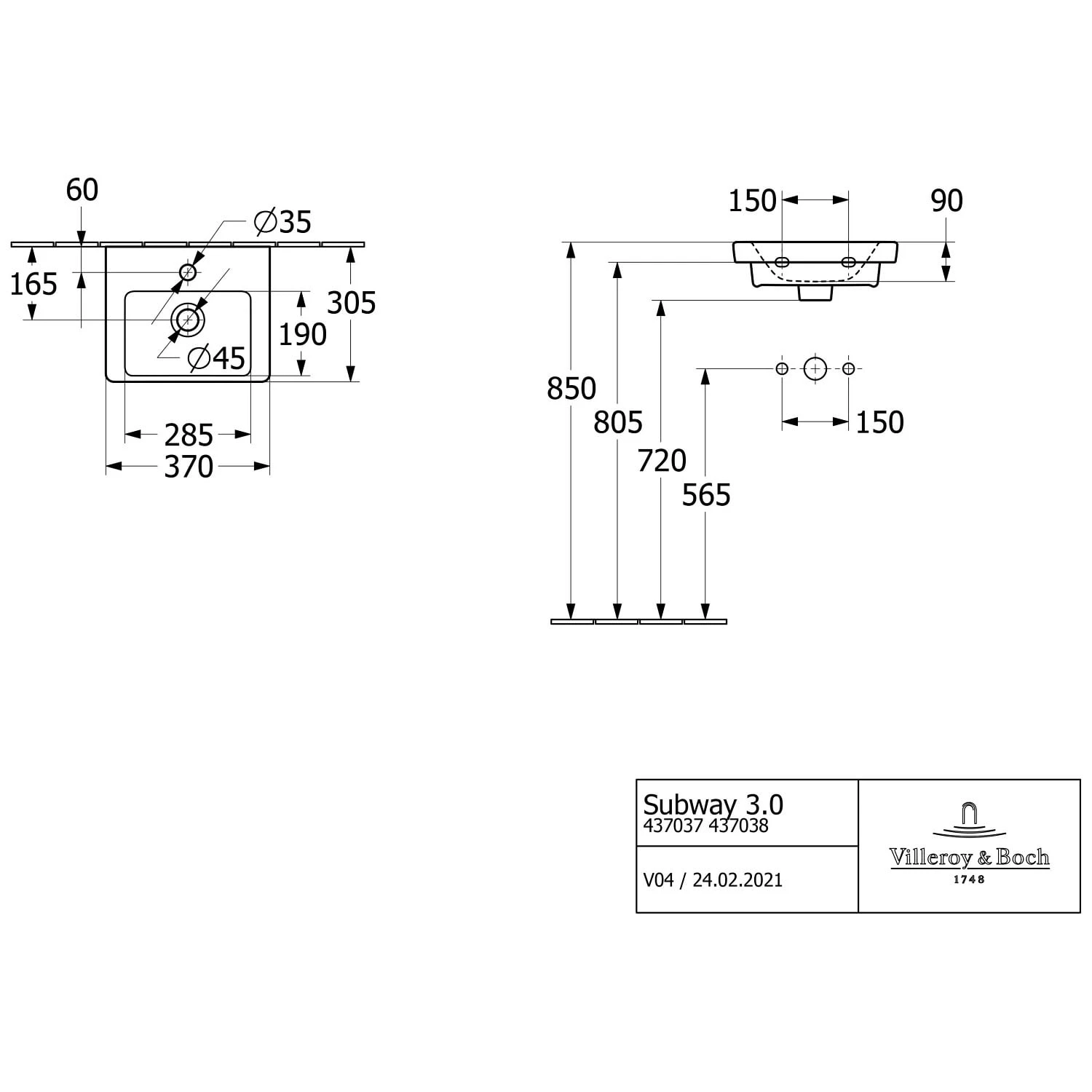 Villeroy & Boch Subway 3.0 Handwaschbecken 37 cm, mit 1 Hahnloch, ohne Überlauf